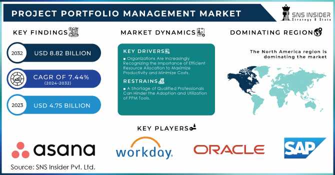 The Project Portfolio Management Market Size was valued at USD 4.75 Billion in 2023, and is expected to reach USD 8.82 Billion by 2032, and grow at a CAGR of 7.44%.